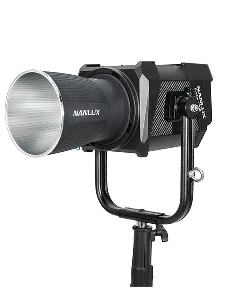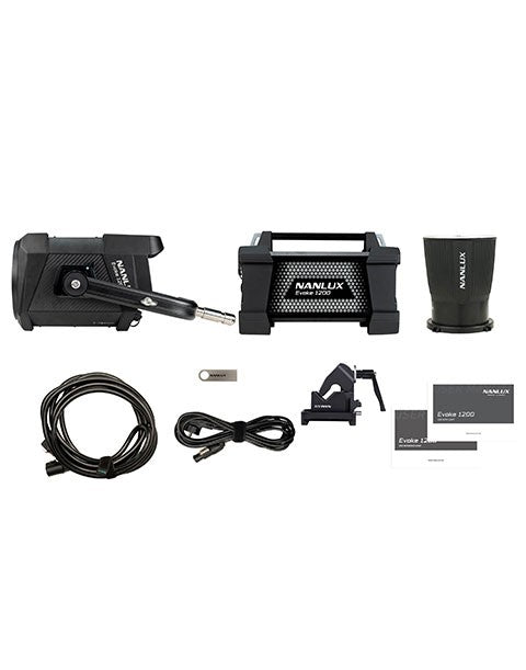 The Nanlux Evoke 1200 LED Daylight Spot Light Kit with Fresnel Lens and Case packs the 5600K light with a dedicated F-35 10° Fresnel attachment and a flight case that fits the entire kit. The Evoke 1200 comes with a 45° reflector, a ballast with two cables, a yoke, and a flash drive. The Fresnel attachment narrows the beam spread from 45 to 10°.