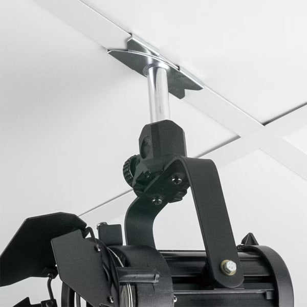 The Kupo Ceiling Frame Mount with Male Spigot Adapter is designed to attach to the metal frame which supports your ceiling tiles. This ceiling clip bracket mount has a 5/8" male stud that accepts lighting fixtures or any compatible 5/8" receiver accessory. Additional 1/4"-20 female thread on the top of baby pin also provides a great mounting solution for a Video/ Audio transmitter.